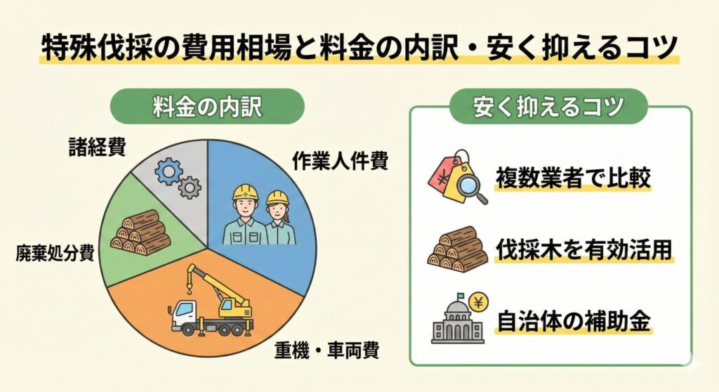 専門技術が必要な特殊伐採は、通常の伐採よりも費用が高くなる傾向があります。ここでは、費用の仕組みと賢く抑えるコツを解説します。