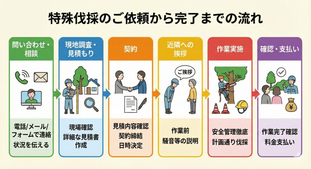 1. 問い合わせ・相談: 電話やメール、公式サイトのフォームから連絡します。木の状況や場所、悩んでいることを伝えましょう。
