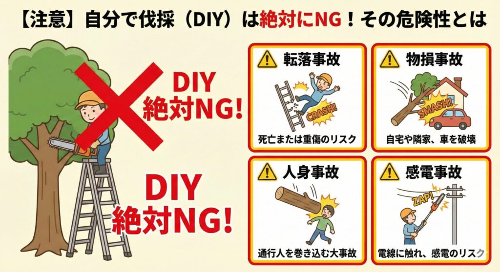 素人が高所の伐採を行うことには、以下のような命に関わる重大なリスクが伴います。