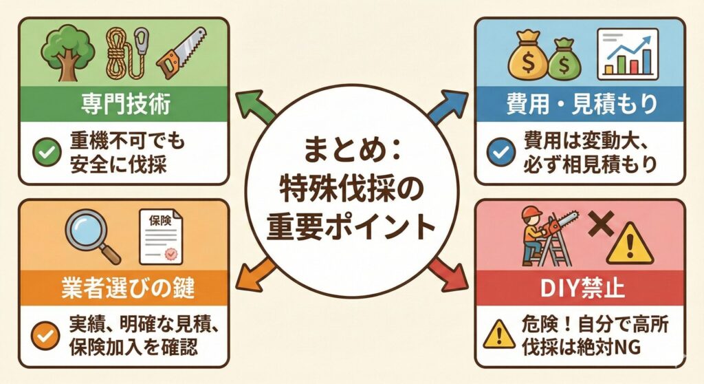 特殊伐採は、一歩間違えれば重大な事故につながる危険な作業です。大切な資産と安全を守るため、業者選びは慎重に行いましょう。