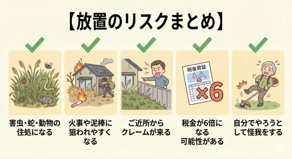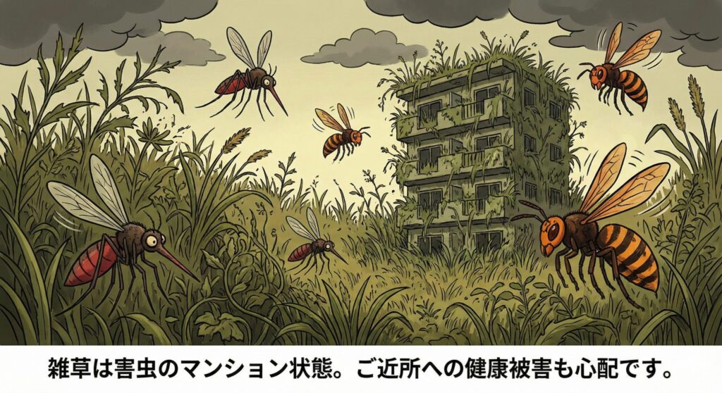 危険生物: スズメバチが巣を作ったり、庭の雑草が茂ることでマムシなどの蛇が住み着いたりし、近隣住民に危害が及ぶ恐れがあります。