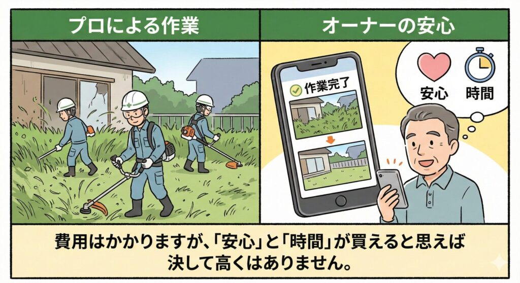 特に高齢の方が無理をして草刈りを行い、熱中症で倒れたり、転倒して骨折したりする事故が多発しています。 誰もいない空き家で倒れてしまったら、発見が遅れて命に関わります。 「節約のために自分で」と思った結果、入院費の方が高くついた…なんてことになったら悲しいですよね。