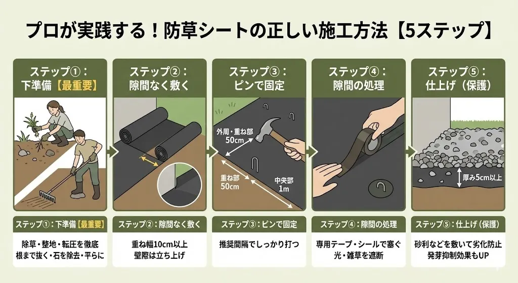 4. プロが実践する!防草シートの正しい施工方法【5ステップ】